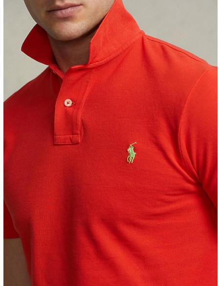Polo Ralph Lauren muška crvena majica na kragnu. Majica je kratkih rukava i klasičnog izgleda. S prednje strane sadrži ovratnik na kopčanje i mali zeleni pony logo. Model je visok 185 cm i nosi veličinu M.