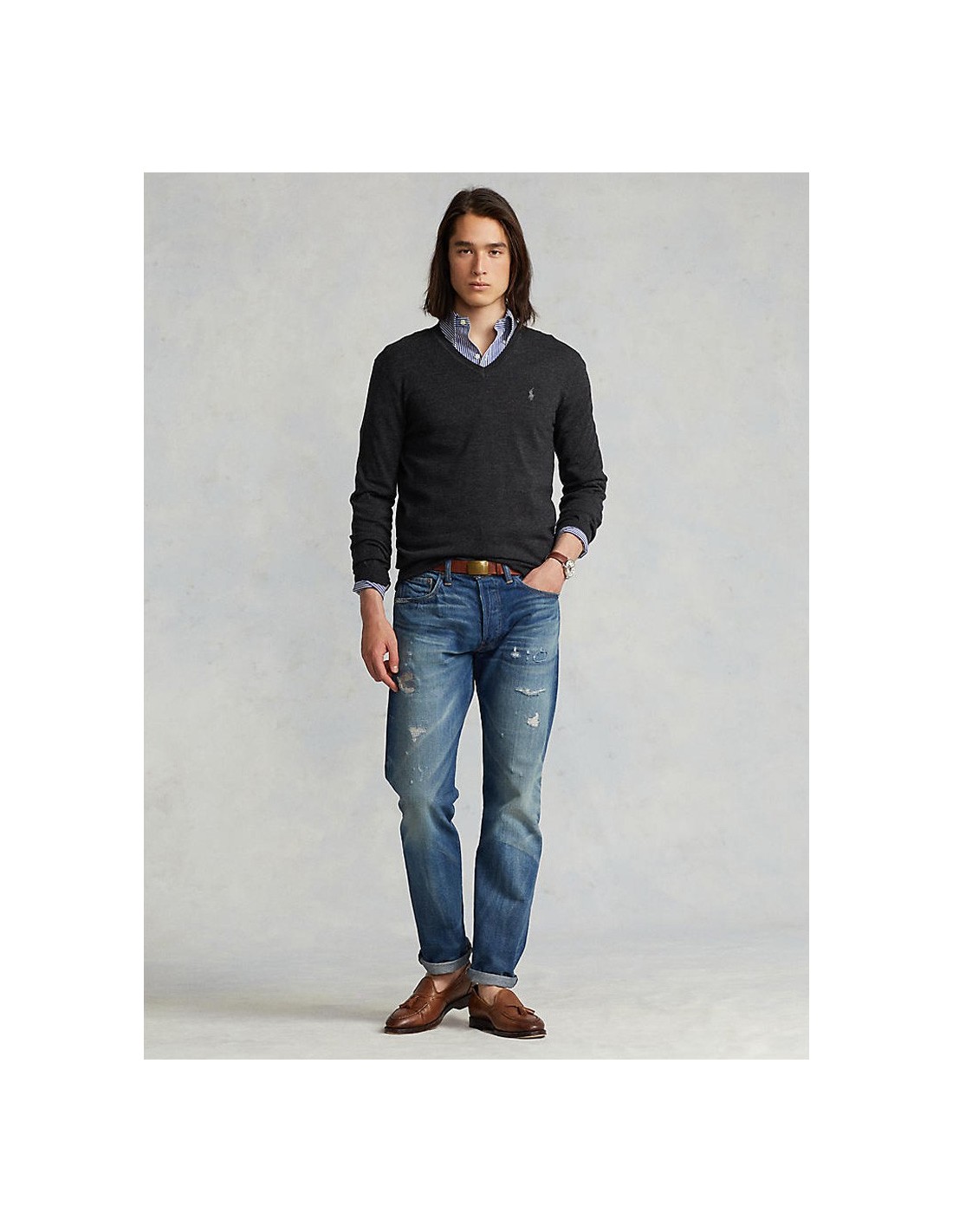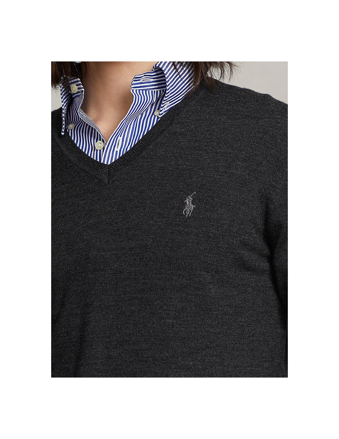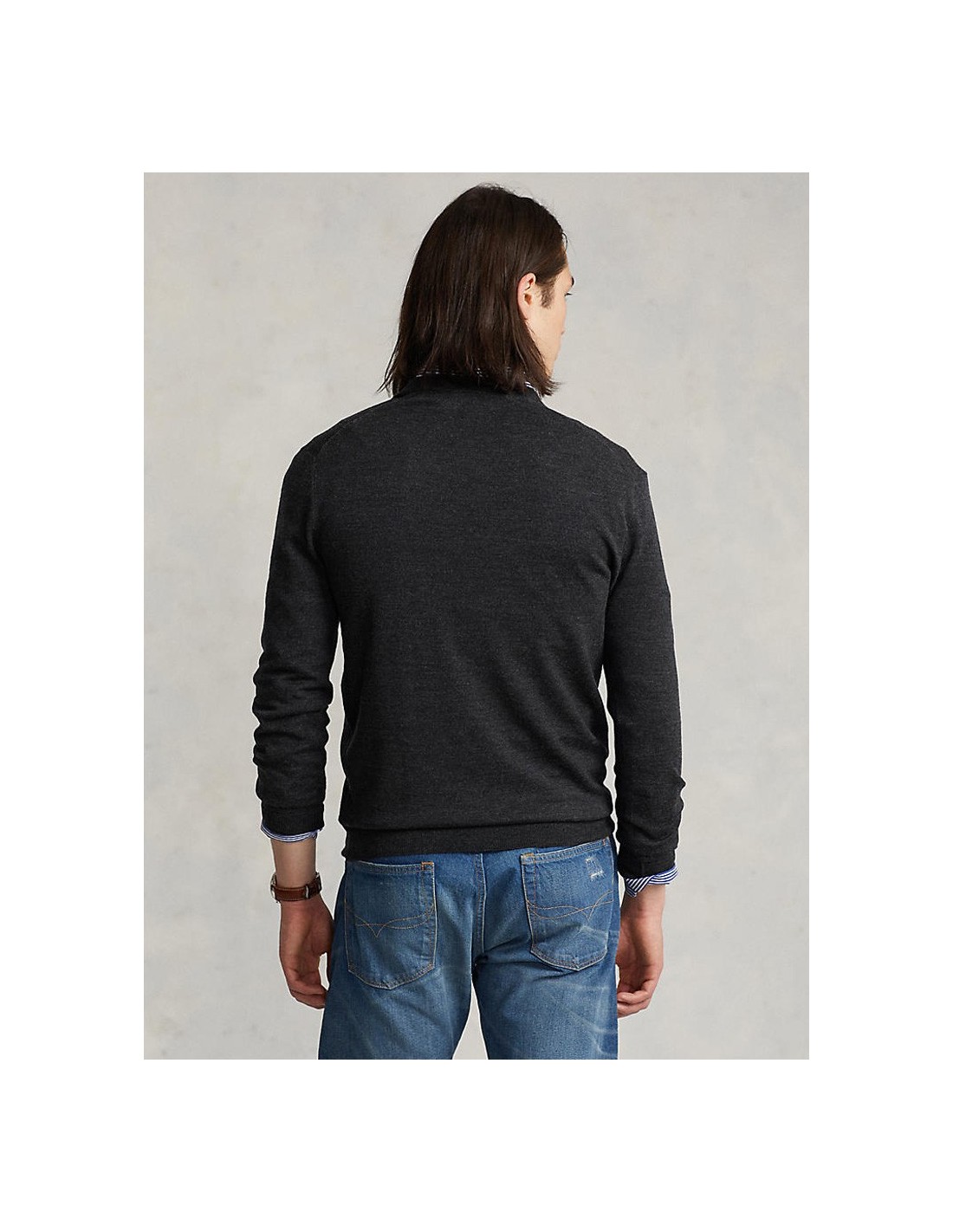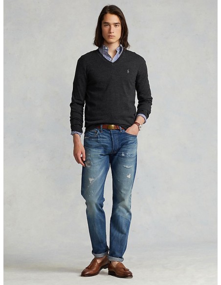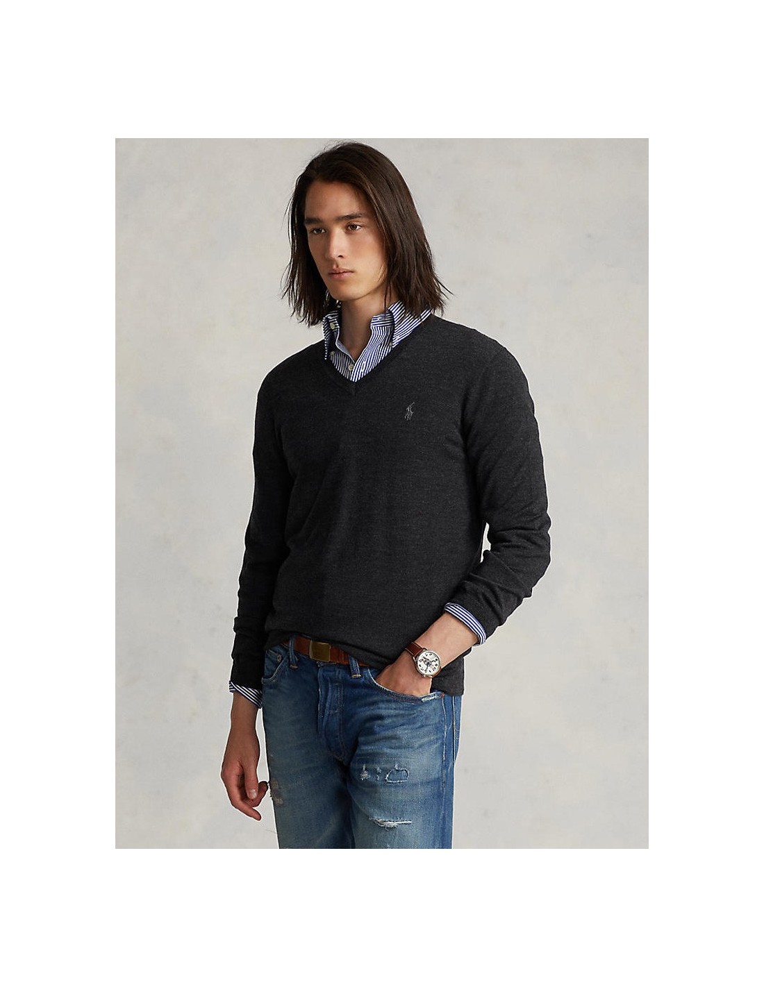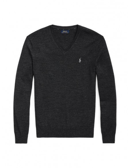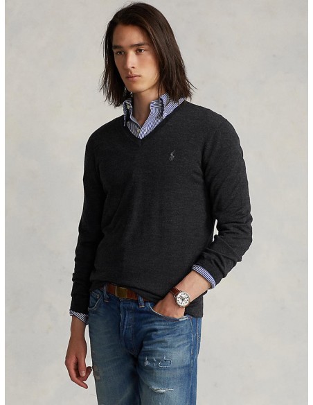 Muška Polo Ralph Lauren siva vesta dugih rukava. S prednje strane veste nalazi se V-izrez i Pony logo. Pristaje uz plavu košulju, plave traperice i smeđe cipele. Idealan izbor za moderan i elegantan izgled. Model je visine 185 cm i nosi veličinu medium.